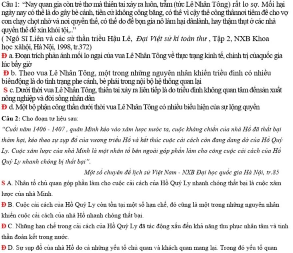 a. Đúng ⇒ Đoạn trích cho thấy vua Lê Nhân Tông lo lắng về tình trạng tham nhũng, sự lộng quyền của quan lại điều này ảnh hưởng tiêu cực đến kinh tế và chính trị đất nước.