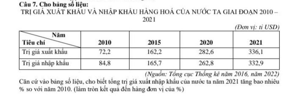 Tổng trị giá xuất nhập khẩu của nước ta năm `2021` tăng số `%` so với năm `2010`