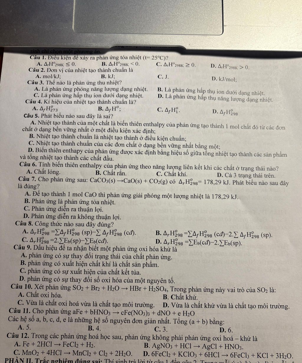 Câu 1. Điều kiện để xảy ra phản ứng tỏa nhiệt (t= 25°C)?