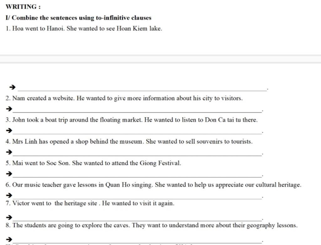 +) Khi kết hợp câu, bỏ "wanted" và dùng "to + động từ nguyên mẫu" để chỉ mục đích.