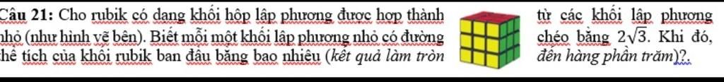 Một khối rubik gồm `27` khối lập phương nhỏ, nên thể tích khối rubik sẽ là `8.27=216`
