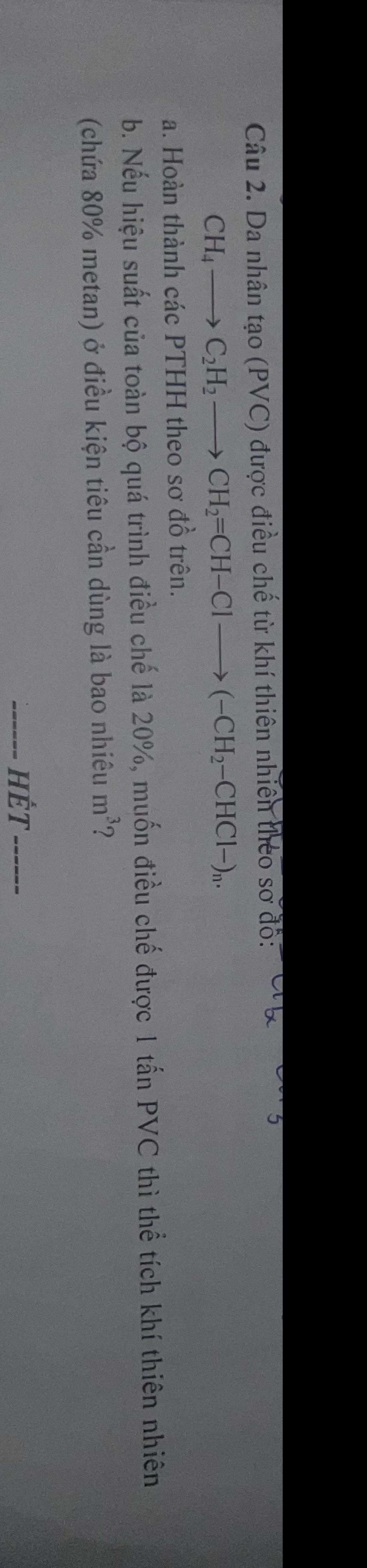 Câu 2. Da nhân tạo (PVC) được điều chế từ khí thiên nhiên theo sơ đồ: tra