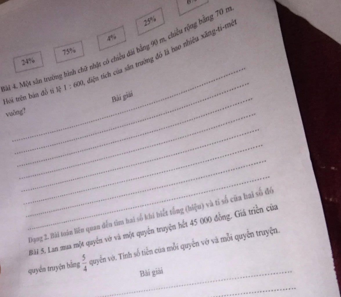 63000000 : 600 = 105000 cm²đáp số : 105000 cm²BÀI GIẢITa có sơ đồQuyển truyện: −−−−− : 5 phần → tổng cộngQuyển vở: −−−− : 4 phần → 45000 đồngTheo sơ đồ,tổng số phần bằng nhau là:5 + 4 = 9 (phần)Giá trị 1 phần là:45000 : 9 = 5000 (đồng)Giá tiền 1 quyển vở là5000 x 4 = 20000 (đồng)Giá tiền 1 quyển truyện là45000 - 20000 = 25000 (đồng)Đáp số : 20000 đồng;25000 đồngHãy giúp mọi người biết câu trả lời này thế nào?