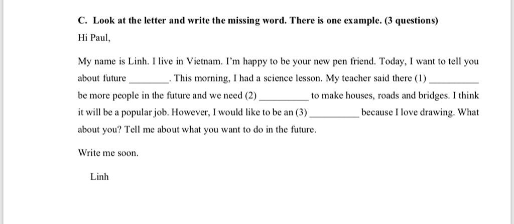 Tên tôi là Linh. Tôi sống ở Việt Nam. Tôi rất vui khi trở thành bạn qua thử của bạn. Hôm nay, tôi muốn kể cho bạn những công việc trong tương lai. Sáng nay, mình có một tiết học khoa học. Giáo viên của mình nói rằng trong tương lai sẽ có nhiều người hơn và chúng ta cần kỹ sư để xây nhà, đường xá và cầu. Mình nghĩ đây sẽ là một công việc phổ biến. Tuy nhiên, mình muốn trở thành một họa sĩ vì mình rất thích vẽ. Còn bạn thì sao? Hãy kể cho mình nghe về công việc bạn muốn làm trong tương lai nhé!