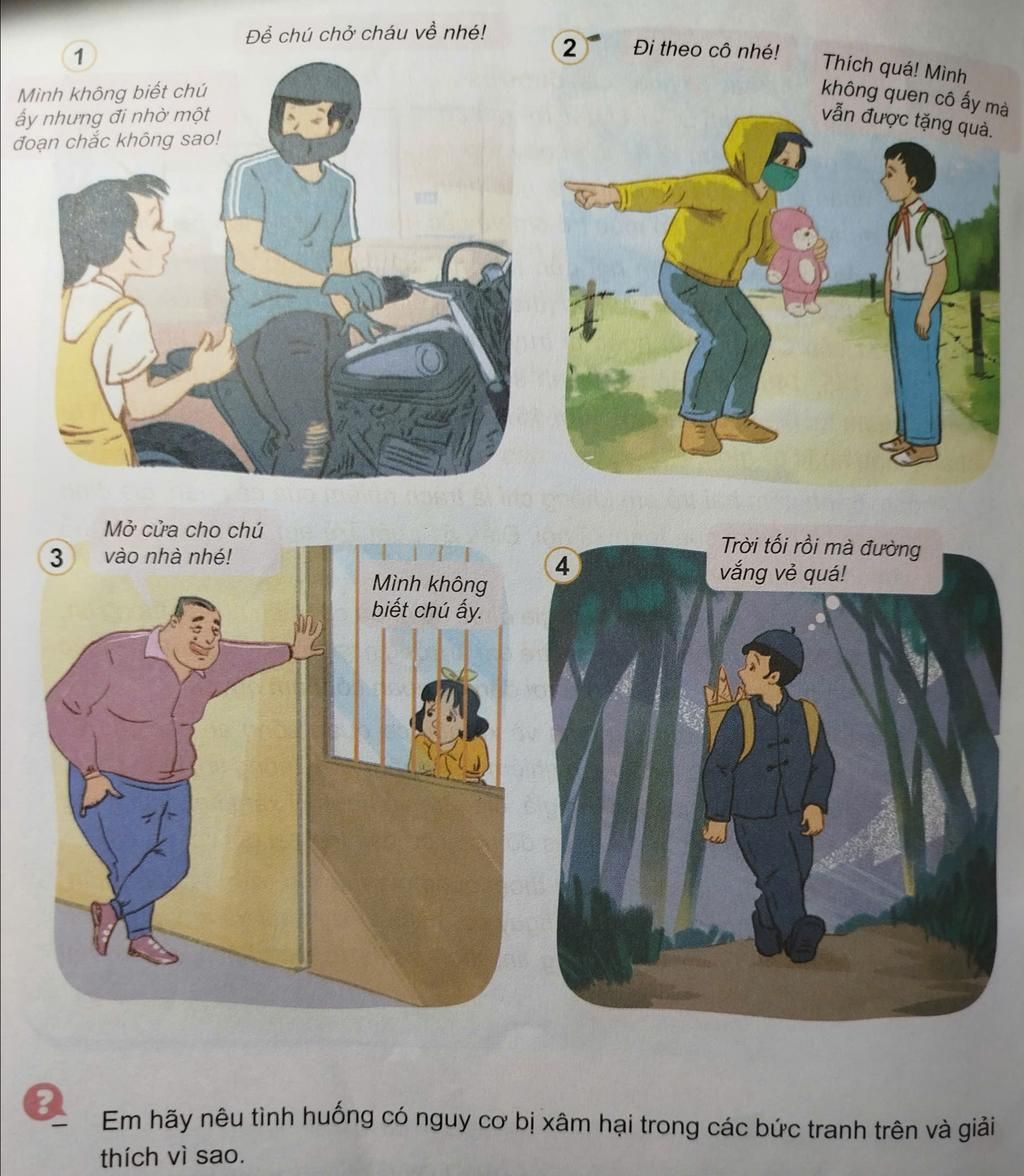 `=>` Các tình huống trên đều tiềm ẩn nguy cơ bị xâm hại, vì vậy trẻ em cần được giáo dục kỹ năng tự bảo vệ như không đi theo người lạ, không nhận quà từ người lạ, không mở cửa cho người lạ và tránh đi một mình ở nơi vắng vẻ, đặc biệt là vào buổi tối.