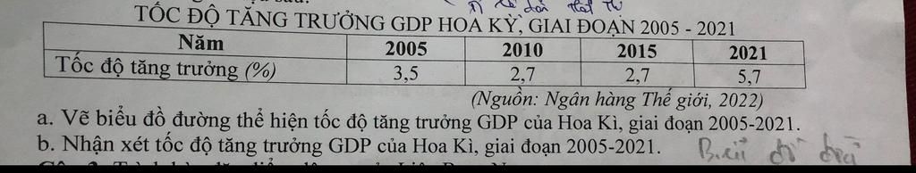a. Vẽ biểu đồ đường thể hiện tốc độ tăng trưởng GDP của Hoa Kì, giai đoạn 2005-2021.
