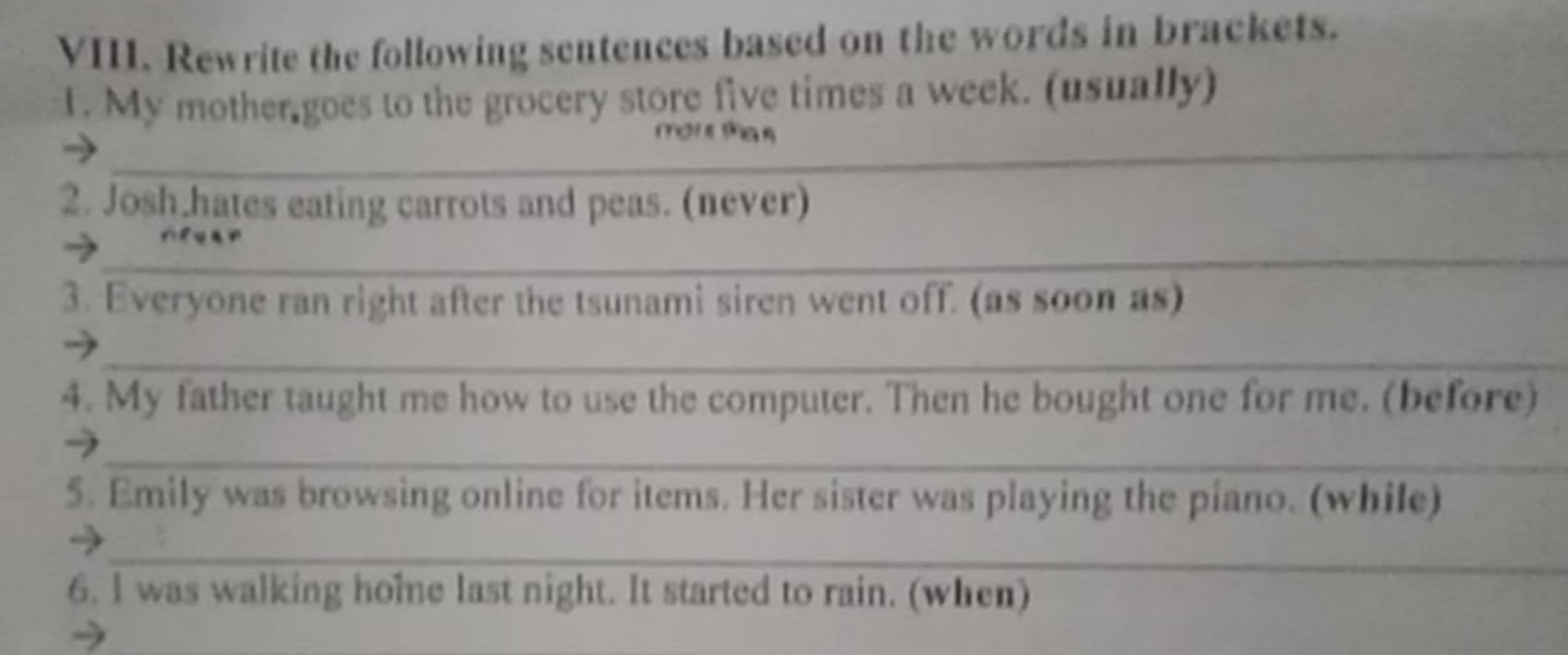 `1,` My mother usually goes to the grocery store five times a week.