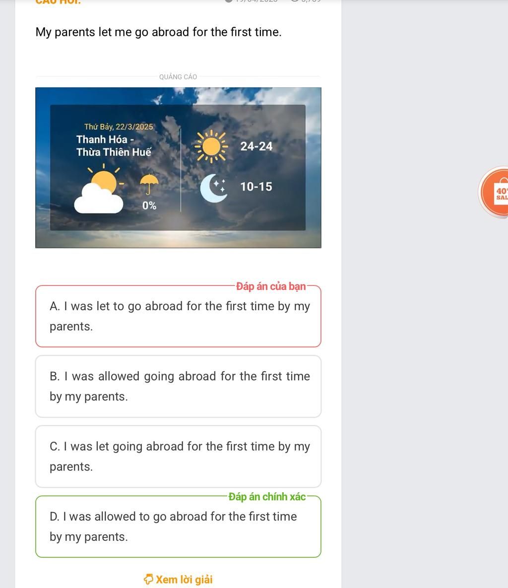 `-` Allow dùng bị động với was allowed to V, nên D đúng.