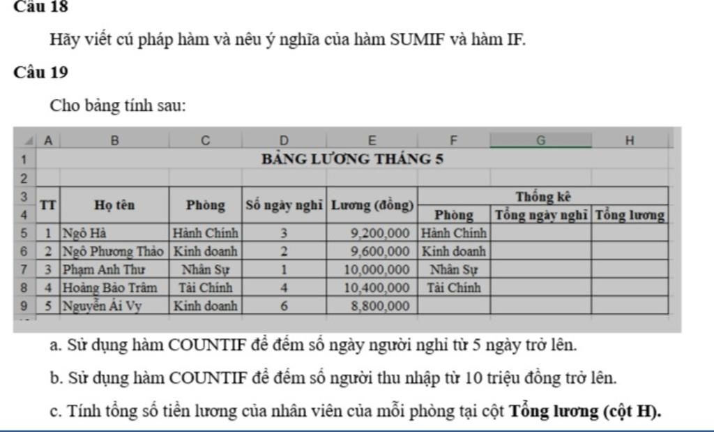 a)=COUNTIF(D5:D9,'>=5') b)=COUNTIF(E5:E9,'>=10000000') c)Ở ô H5: =SUMIF($C$5:$C$9,F5,$E$5:$E$9) copy công thức xuống để tính được từng phòng