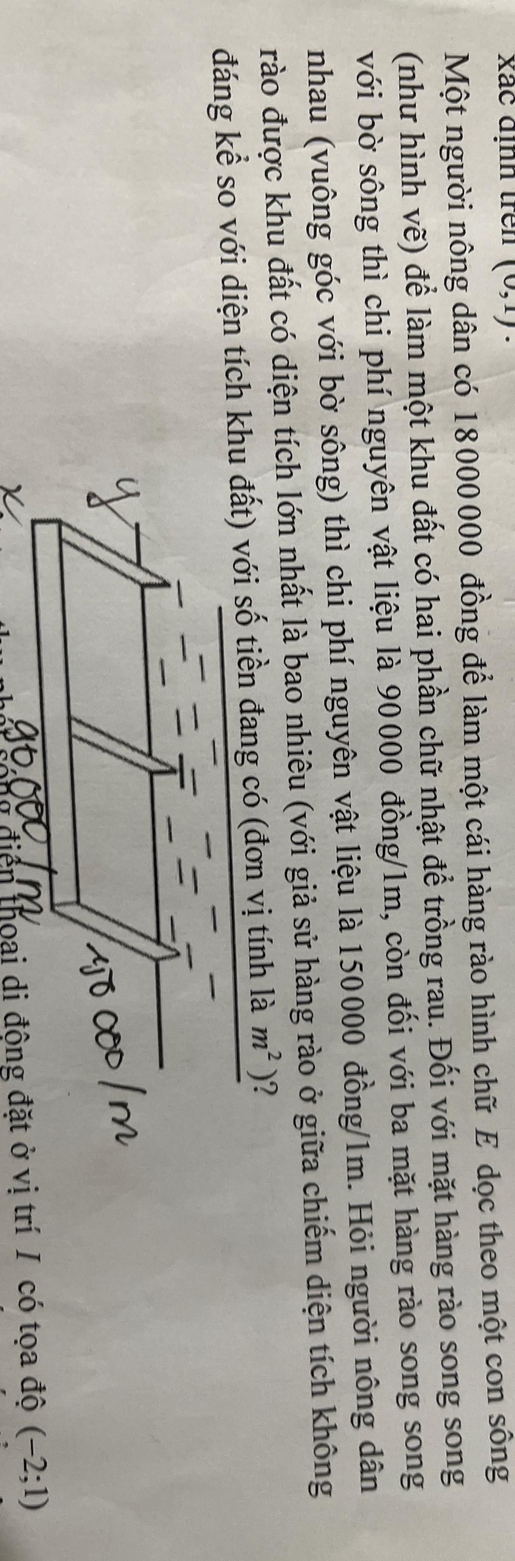 Một người nông dân có 18 000 000 đồng để làm một cái hàng rào hình chữ E dọc theo một con sông để làm một khu đất có hai phần chữ nhật để trồng rau. Đối với mặt hàng rào song song với bờ sông thì chi phí nguyên vật liệu là 90000₫/1m còn đối với ba mặt hàng rào song song với nhau (vuông góc với bờ sông) thì chi phí nguyên vật liệu là 150000₫/1m. Hỏi người nông dân rào đc khu đất có diện tích lớn nhất là bao nhiêu (với giả sử hàng rào ở giữa chiến diện tích không đáng kể) với số tiền đang có (đơn vị m2)