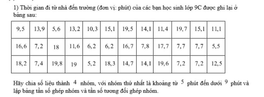 1) Thời gian đi từ nhà đến trường (đơn vị: phút) của các bạn học sinh lớp 9C được ghi lại ở
