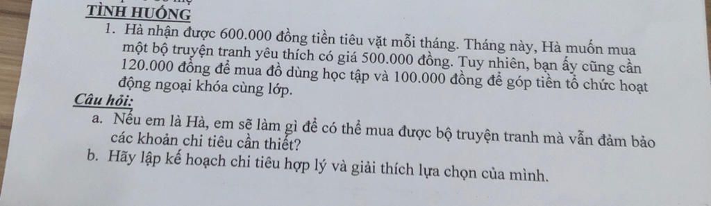 Nếu em là H em sẽ vẫn đóng tiền ngoại khóa và đồ dùng học tập vì chúng quan trọng và phục vụ lâu dài còn truyện tranh sẽ tích tiền lại tháng sau có 600 000đ tiếp mới cân nhắc và mua truyện tranh