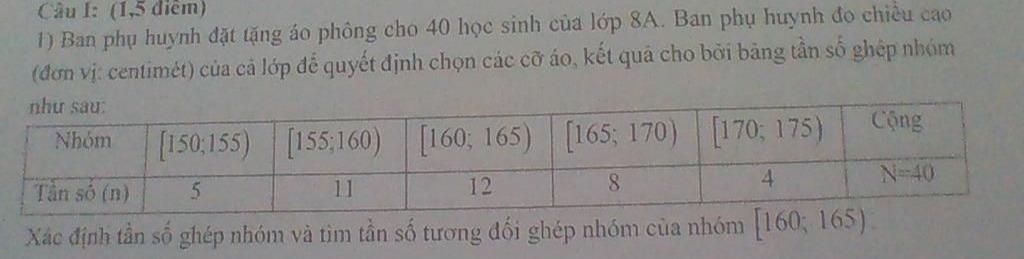 `-` Tần số tương đối ghép nhóm của nhóm `[160; 165)`: `f = \frac{n}{N} · 100% = \frac{12}{40} · 100% = 30%`