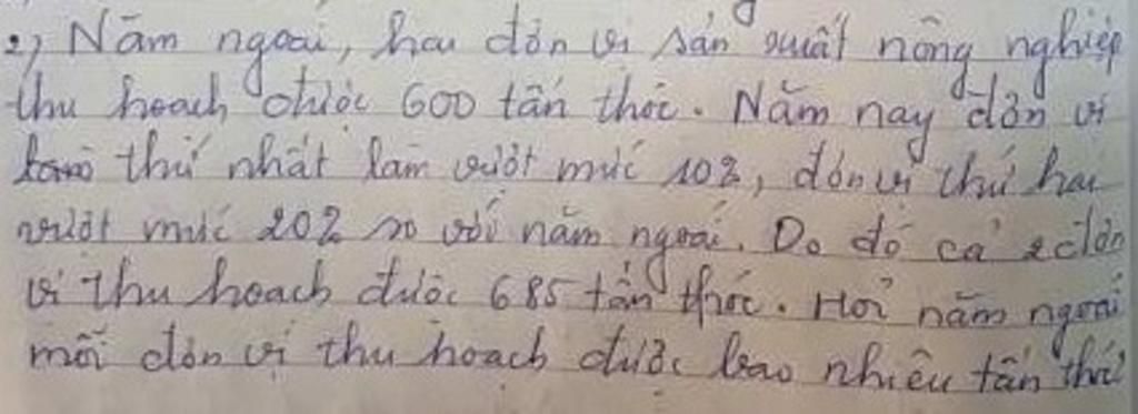"Năm ngoái, khu dân cư sản xuất nông nghiệp thu hoạch được 600 tấn thóc. Năm nay do ít hơn thu hoạch năm ngoái mất 10%, đồng thời hao hụt mất 20% so với năm ngoái. Do đó, cả xóm chỉ thu hoạch được 68 tấn thóc. Hỏi năm nay mỗi dân ở thu hoạch được bao nhiêu tấn thóc?"