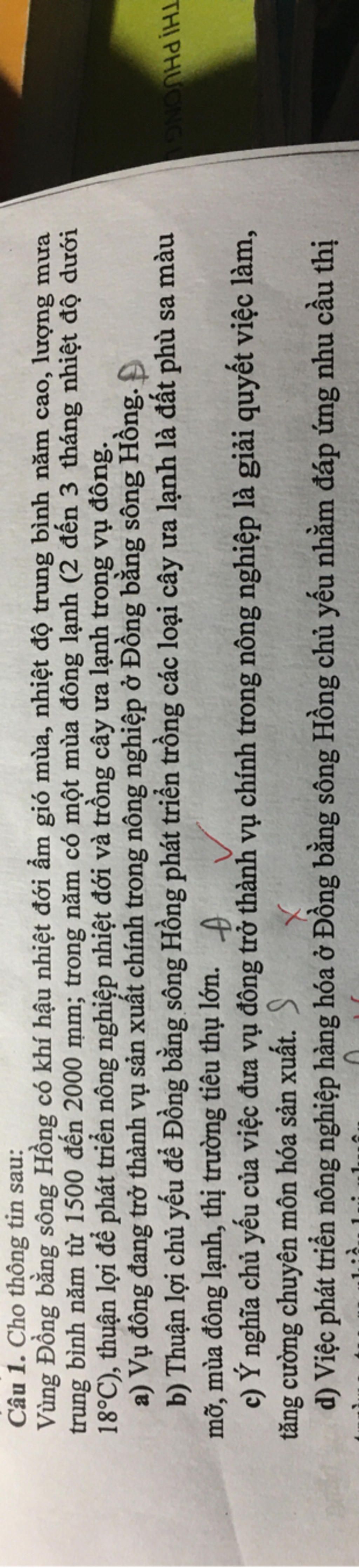 Câu a: Đúng ⇒ Vì vụ đông có ý nghĩa quan trọng trong sản xuất nông nghiệp tại Đồng bằng sông Hồng, nhất là trong việc tận dụng điều kiện khí hậu để trồng cây ưa lạnh.