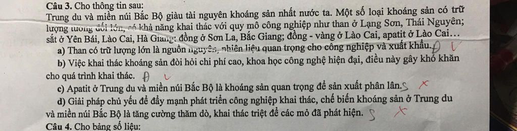 c. Đúng ⇒ Apatit (ở Lào Cai) là nguồn nguyên liệu chính để sản xuất phân lân. Apatit chứa nhiều photphat, thành phần quan trọng trong phân bón giúp tăng năng suất cây trồng. Đây là loại khoáng sản chiến lược trong ngành công nghiệp hóa chất, phân bón của nước ta.