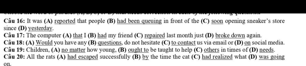 Câu 16: It was (A) reported that people (B) had been queuing in front of the (C) soon opening sneaker's store