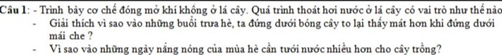 `-` Cơ chế đóng mở khí khổng ở lá cây là: Khi cây thiếu nước, không cung cấp đủ thì tế bào khí khổng giảm xuống đồng thời khiến khí khổng khép lại giảm quá trình thoát hơi nước cây để cây đủ nước. Nếu cây đủ nước thì tế bào khí khổng căng ra làm khí khổng rộng nên quá trình thoát hơi nước nhiều.