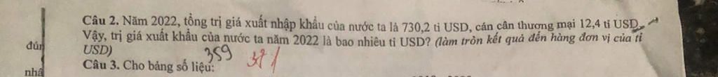 CT: Giá trị xuất khẩu `=(` Tổng giá trị xuất nhập khẩu `+` Cán cân xuất nhập khẩu `):2` $\\$ Giá trị xuất khẩu nước ta năm `2022`:$\\$ `(730,2+12,4)/2~~371(`tỉ USD`)`