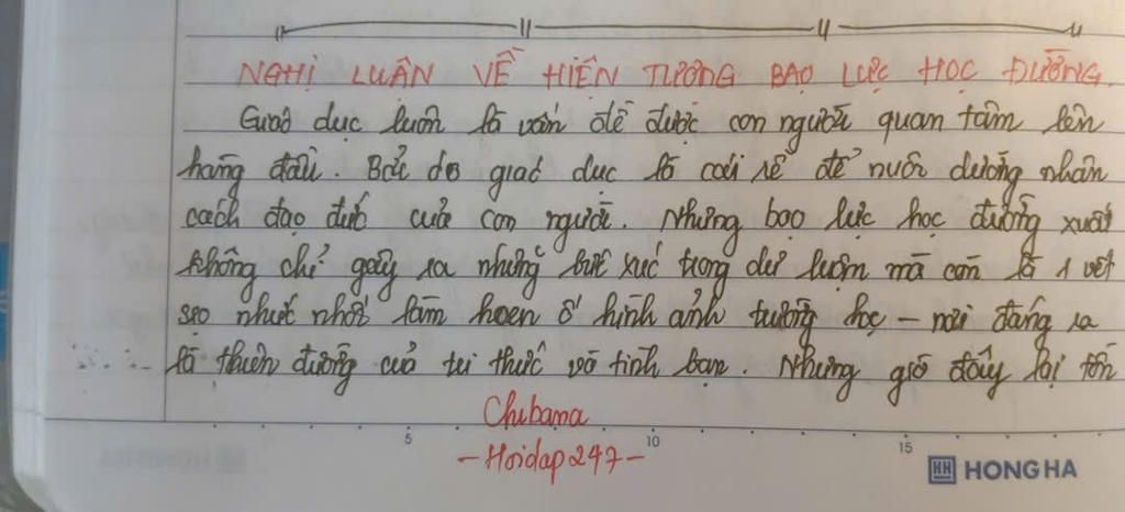 Bạo lực học đường có thể xảy ra dưới nhiều hình thức ví dụ như : từ đánh nhau, bắt nạt , cô lập bạn bè cho đến việc sử dụng mạng xã hội để bôi nhọ, lăng mạ, thậm chí lột quần áo để đánh đập . Nguyên nhân có thể đến từ sự thiếu quan tâm của gia đình, môi trường giáo dục chưa đủ chặt chẽ , hoặc ảnh hưởng từ các nội dung độc hại trên mạng. Một số học sinh thiếu kỹ năng giao tiếp, thiếu sự cảm thông và kiểm soát cảm xúc đã lựa chọn cách hành xử tiêu cực để giải quyết ổn định. Hậu quả của bạo lực học đường vô cùng nguy hiểm. Nhân vật có thể là một người có thể phức tạp cả thể chất lẫn tinh thần, dẫn đến trầm cảm, sợ hãi, thậm chí nghĩ đến việc t.ự t.ử. Không chỉ vậy, người gây ra bạo lực cũng dễ hình thành thói quen xấu, ảnh hưởng đến tương lai và nhân cách sau này. Môi trường học tập cũng vì thế mà mất đi sự trong lành, tích cực. Để ngăn chặn và thúc đẩy bạo lực học đường, mỗi học sinh cần nâng cao ý thức, cư xử lý văn minh, biết tôn trọng và lắng nghe lẫn nhau. Gia đình cần quan tâm, đồng hành với con cái, còn nhà trường nên tăng cường giáo dục đạo đức, kỹ năng sống và xây dựng môi trường thân thiện, an toàn. Đặc biệt, khi chứng kiến sức mạnh bạo lực, chúng ta không nên im lặng mà cần có thể biết hoặc báo cho người lớn để kịp thời xử lý.