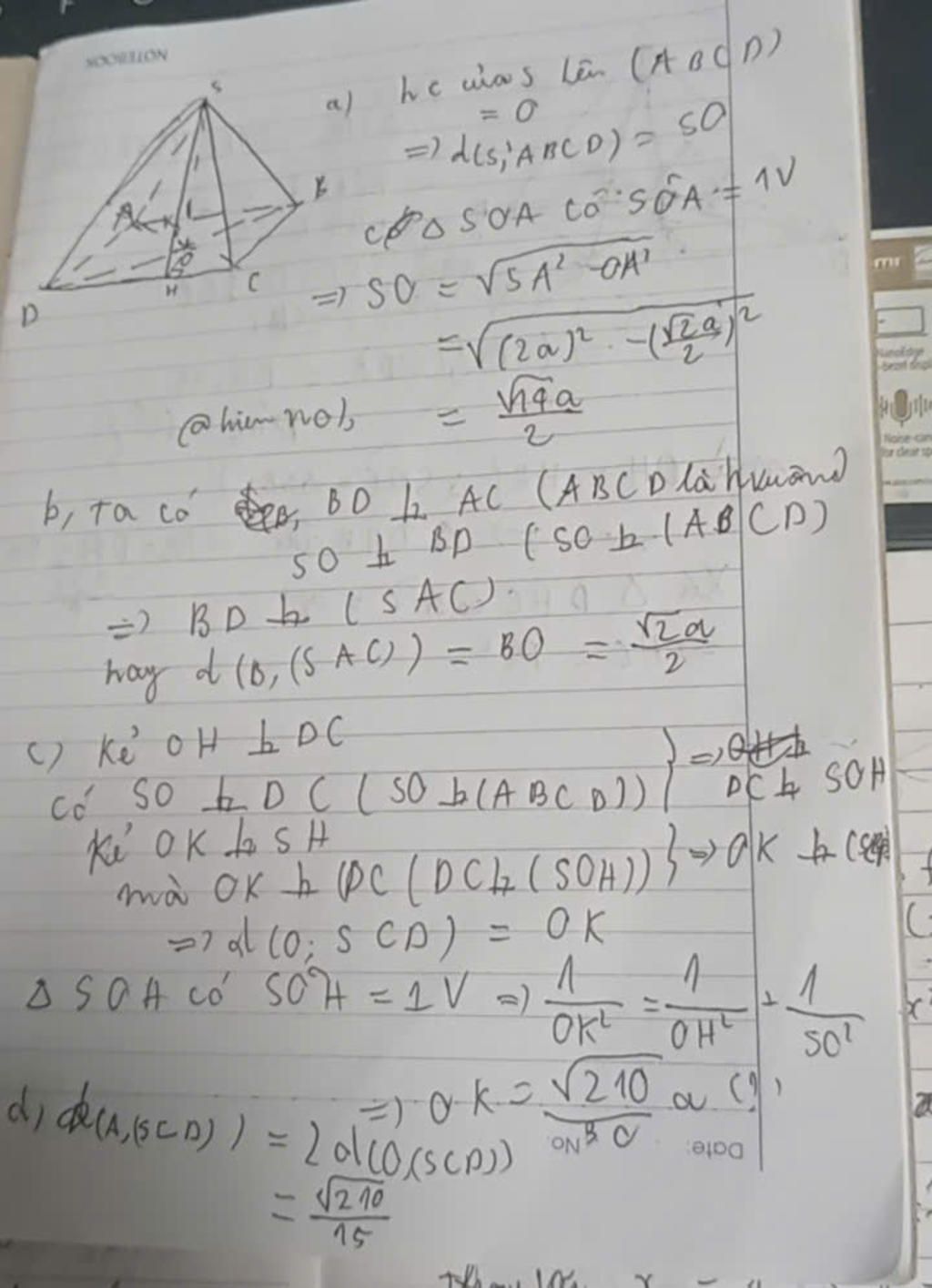 Cho hình chóp đều S.ABCD có cạnh đáy bằng a, gọi O là giao điểm của AC và BD. SA=2a. Tính: