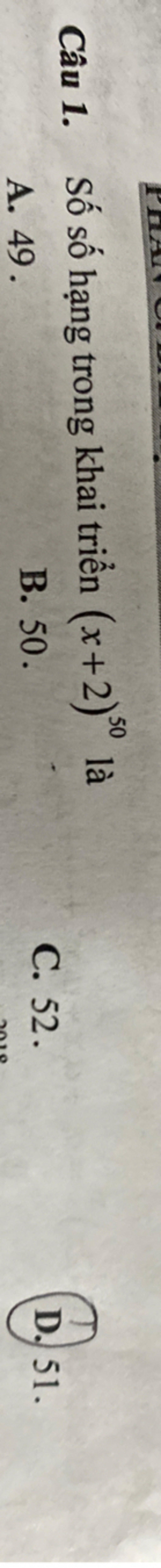 Do đó, số số hạng của `(x+2)^50` là `50+1=51`.