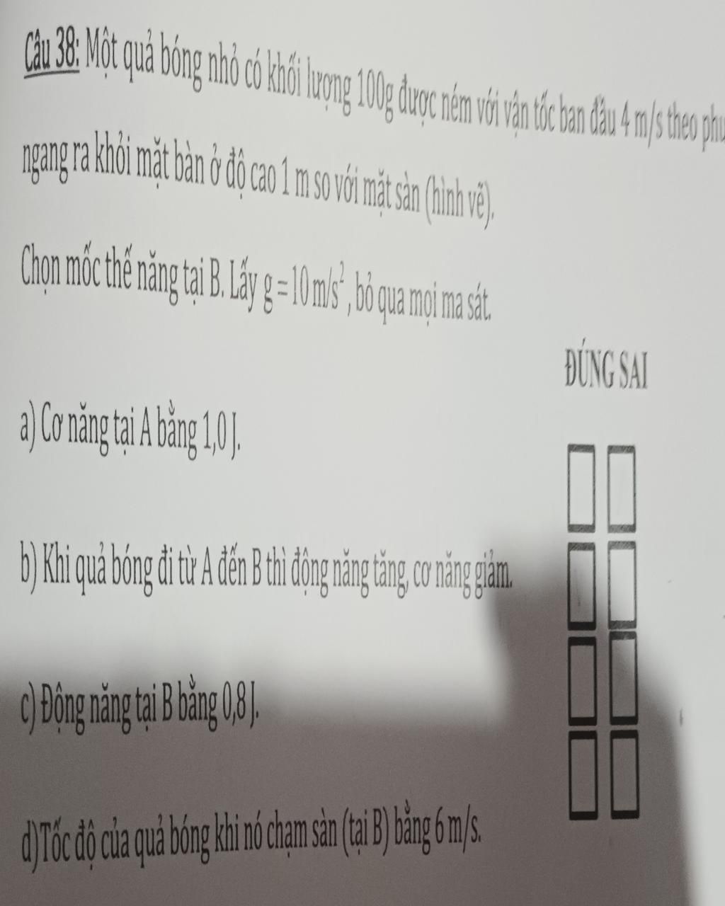 Câu 38: Một quả bóng nhỏ có khối lượng 100g được ném với vận tốc ban đầu 4 m/s theo phương ngang ra khỏi mặt bàn ở độ cao 1 m so với mặt sản (hình vẽ).