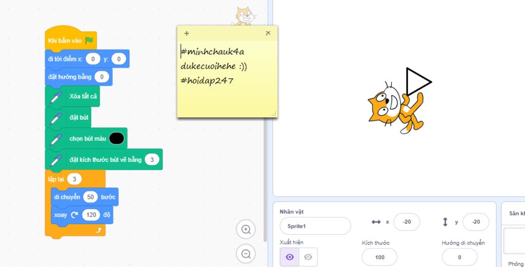 Câu 2: Em hãy viết chương trình Scratch thực hiện điều khiển nhân vật di chuyển theo đường đi là một hình tam giác đều có cạnh bằng 50 bước đi của nhân vật.