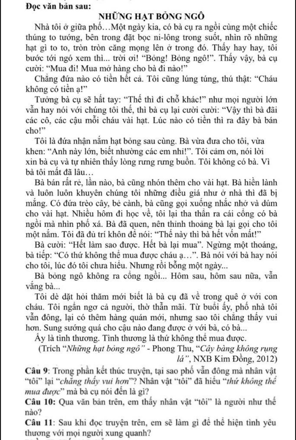 câu 9: vì nhân vật tôi buồn khi bà bán bỏng đã về quê ở với con cháu ,nhân vật tôi đã hiểu thứ không thể mua được đó chính là tình người