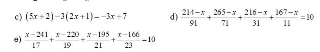 e) $\frac{x-241}{17}$ `+` $\frac{x-220}{19}$ `+` $\frac{x-195}{21}$ `+` $\frac{x-166}{23}$ `=10`