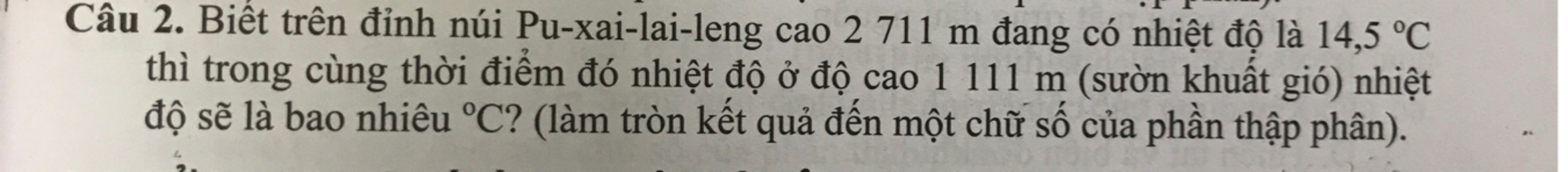 Ở sườn khuất gió, theo tiêu chuẩn của không khí khô, khi xuống núi trung bình $\rm100\, m$, nhiệt độ tăng $\rm 1^\circ C$$\\$ Cùng một thời điểm tại đỉnh núi Pu-xai-lai-leng ở độ cao $\rm 1\,111$ thì nhiệt độ:$\\$ $\rm{14,5+\dfrac{(2\,711-1\,111)\times1}{100}}=30,5^\circ C$