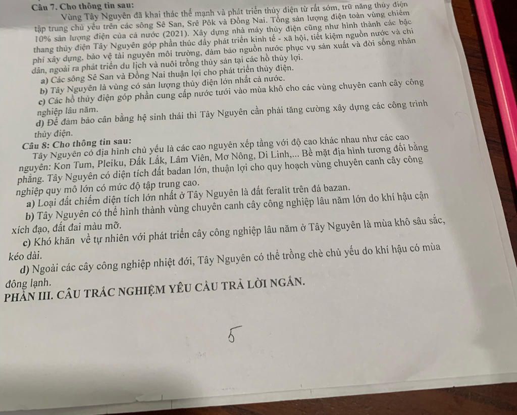 b. Sai → Tây Nguyên có sản lượng thủy điện lớn nhưng không phải lớn nhất cả nước, khu vực Tây Bắc và Trung du miền núi Bắc Bộ có tiềm năng thủy điện cao hơn.