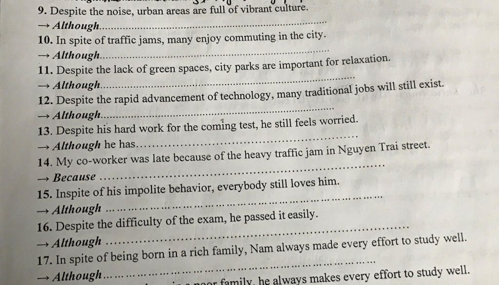 `14` Because there was a heavy traffic jam in Nguyen Trai street, my co-worker was late.