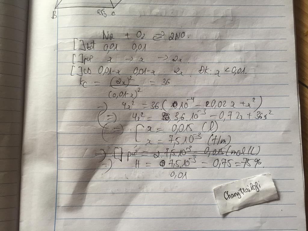 Cho phản ứng N2 + O2 ⇌ 2 NO có KC= 36. Biết rằng nồng độ ban đầu của N2 và O2 đều bằng