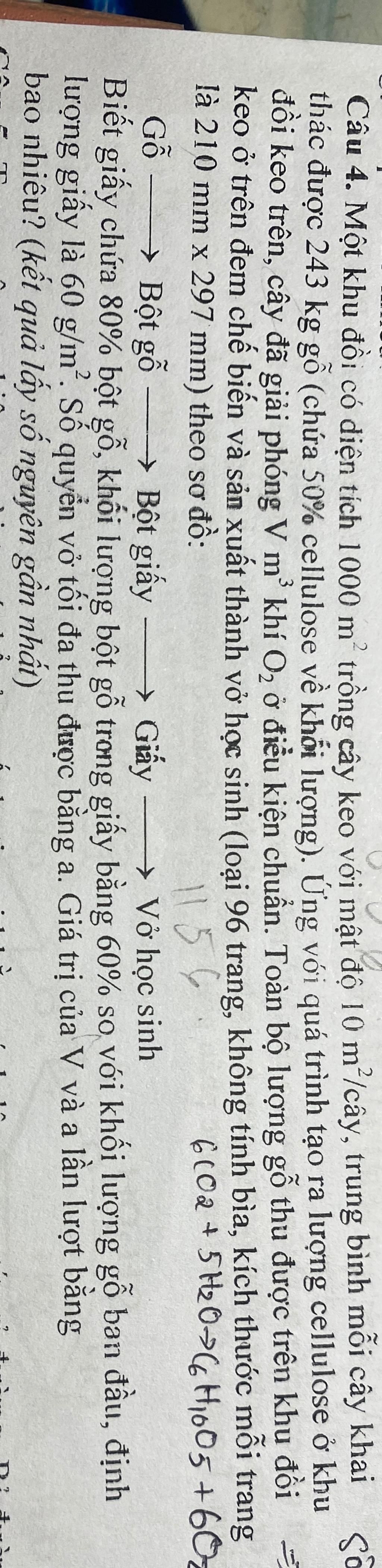 thác được 243 kg gỗ (chứa 50% cellulose về khối lượng). Ứng với quá trình tạo ra lượng cellulose ở khu