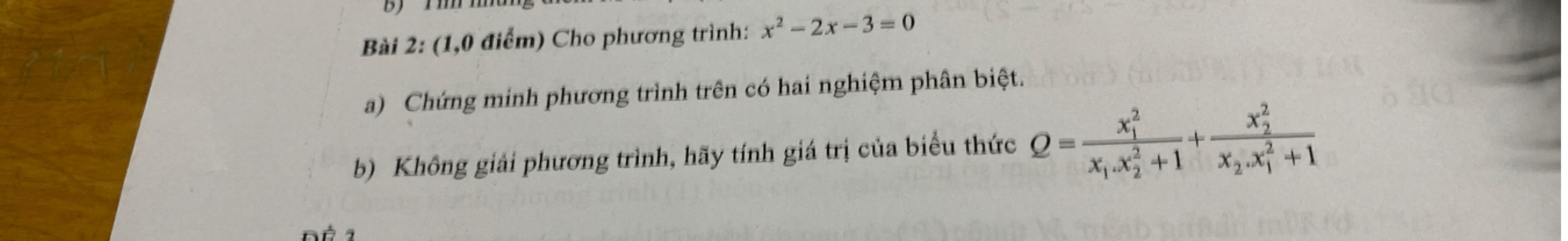 $\to Q=\dfrac{2x_1+3}{-3x_2+1}+\dfrac{2x_2+3}{-3x_1+1}$ vì $x^2-2x-3=0\to x^2=2x+3$