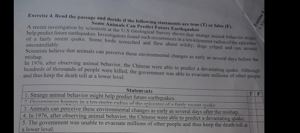 `-` Dẫn chứng: In 1976, after observing animal behavior, the Chinese were able to predict a devastating quake.