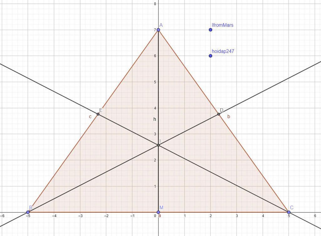 sos với ạ: Cho Delta*ABC cân tại A. Hai đường phân giác BD và CE cắt nhau tại 1. Gọi M là trung điểm cạnh BC. Chứng minh ba điểm A, I, M thẳng hàng. (Vẽ cả hình)