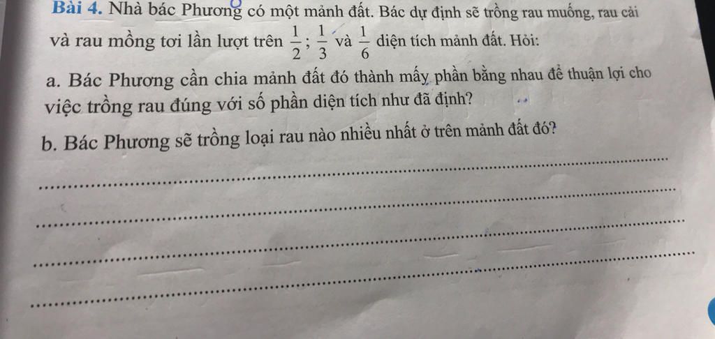 a)Bác Phương cần chia mảnh đất thành 6 phần bằng nhau để thuận lợi cho việc trồng rau đúng với số phần diện tích.