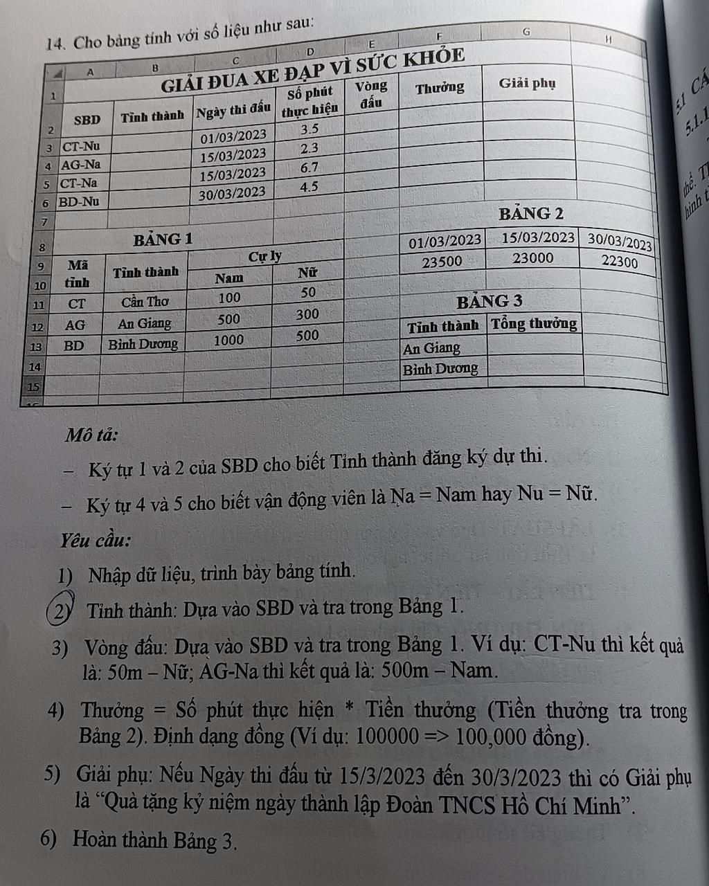 LEFT(A3,2) lấy 2 ký tự đầu của SBD (ví dụ: "CT").11:latex$K$13 là vùng chứa Bảng 1 (bao gồm cả cột Cự ly Nam và Nữ).IF(RIGHT(A3,2)="Na",3,2): Nếu 2 ký tự cuối của SBD là "Na" (Nam), thì lấy cột thứ 3 (Cự ly Nam), ngược lại lấy cột thứ 2 (Cự ly Nữ).RIGHT(A3,2) lấy 2 ký tự cuối của SBD để xác định giới tính.&"m - "&IF(RIGHT(A3,2)="Na","Nam","Nữ") nối thêm "m - Nam" hoặc "m - Nữ" vào kết quả.4) Thưởng = Số phút thực hiện * Tiền thưởng (Tiền thưởng tra trong Bảng 2). Định dạng đồng (Ví dụ: 100000 => 100,000 đồng).