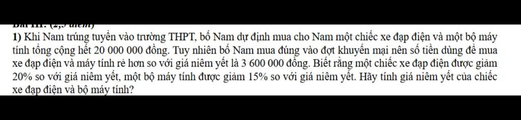 Đáp án: Xe đạp: $12$ triệu, máy tính: $8$ triệu