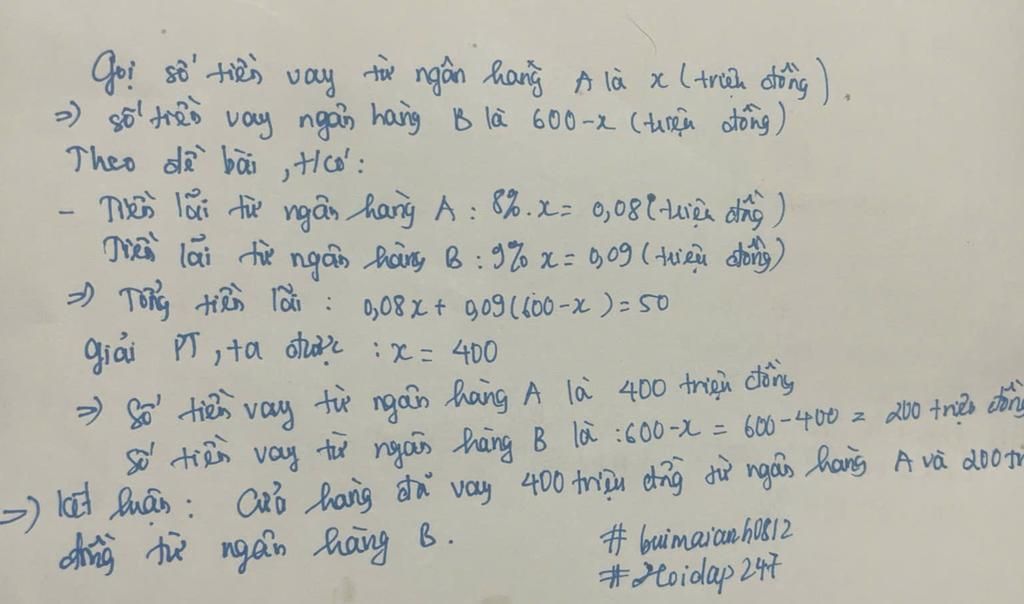Để mở rộng kinh doanh,một cửa hàng đã vay 600 triệu dồng kì hạn 12 tháng từ hai ngân hàng A và B với lãi suất lần lượt là 8% năm và 9% năm.Tổng số tiền lãi một năm phải trả cho cả hai ngân hàng là 50 triệu đồng. Tính số tiền của cửa hàng đã vay từ mỗi ngân hàng