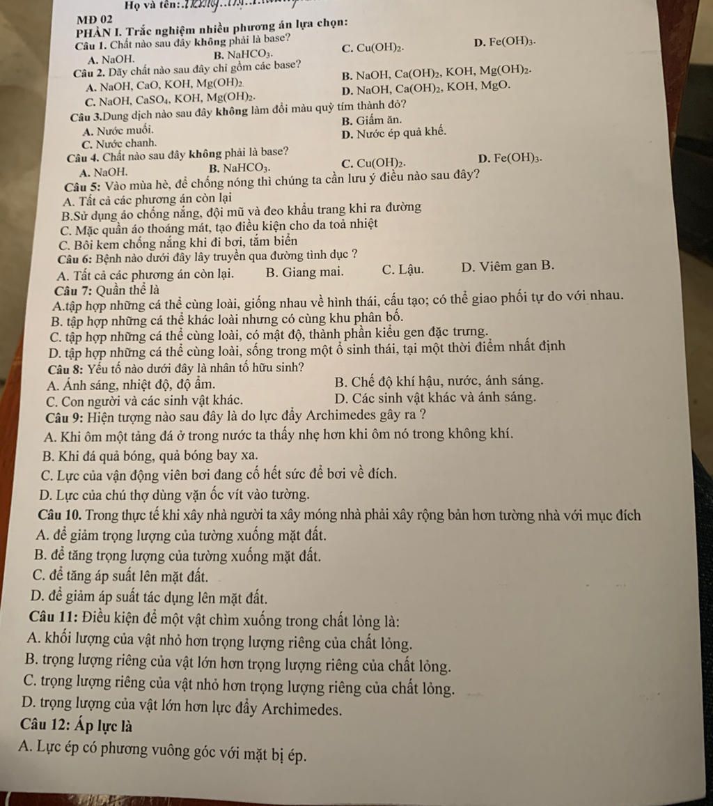 Gt : NaOH , Cu(OH)2 và Fe(OH)3 đều là các base. NaHCO3 là muối acid