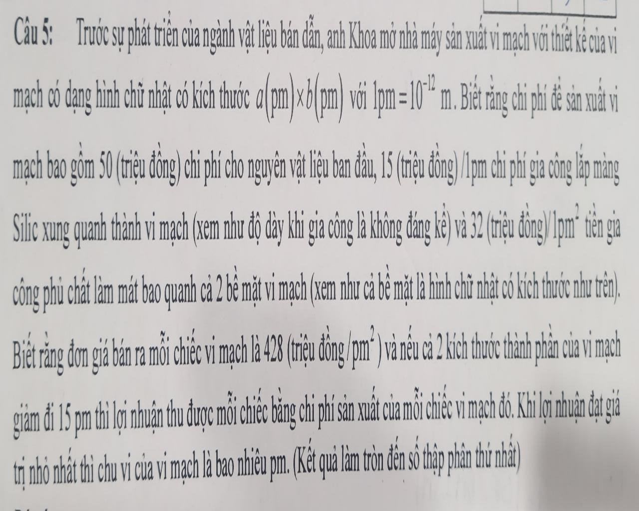 Lập bbt $\to$Lợi nhuận nhỏ nhất là: