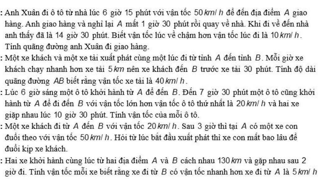 : Anh Xuân đi ô tô từ nhà lúc 6 giờ 15 phút với vận tốc 50 km/ h để đến địa điểm A giao