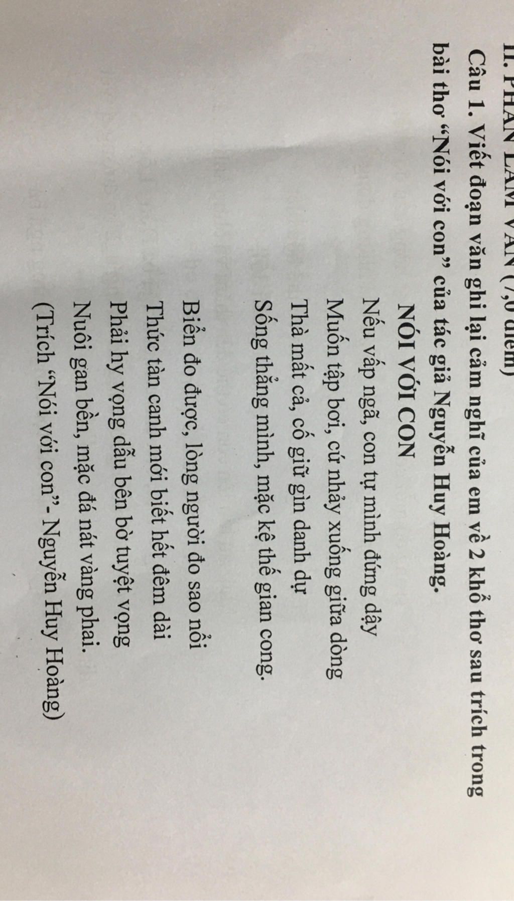 Hai khổ thơ trên trong bài “Nói với con” của Nguyễn Huy Hoàng mang đến những bài học sâu sắc về ý chí, lòng tự trọng và sự kiên trì trong cuộc sống. Khổ thơ đầu đã khẳng định tinh thần tự lập, ý chí kiên cường của con người. Khi vấp ngã, ta phải biết tự đứng dậy; khi muốn học bơi, phải dũng cảm nhảy xuống dòng nước chứ không thể mãi đứng bên bờ. Những hình ảnh ẩn dụ ấy nhắc nhở con người phải mạnh mẽ, chủ động đối diện với khó khăn, thử thách. Đặc biệt, câu “Thà mất cả, cố giữ gìn danh dự” nhấn mạnh giá trị của lòng tự trọng, nhắc nhở mỗi người phải sống ngay thẳng, không vì lợi ích mà đánh mất phẩm giá của mình. Dù thế gian có thể cong nhưng bản thân ta phải luôn giữ vững chính mình. Sang đến khổ thơ thứ hai mang đậm triết lý nhân sinh. Tác giả sử dụng hình ảnh đối lập “biển đo được, lòng người đo sao nổi” để khẳng định sự phức tạp, khó lường của lòng người. Câu thơ “Thức tàn canh mới biết hết đêm dài” gợi lên sự thấu hiểu, chiêm nghiệm sâu sắc về cuộc đời. Đặc biệt, hai câu thơ cuối khuyến khích con người luôn giữ vững hy vọng, ngay cả khi đứng trước tuyệt vọng. “Nuôi gan bền, mặc đá nát vàng phai” thể hiện tinh thần kiên trì, ý chí bền bỉ, không khuất phục trước thời gian và khó khăn. Hai khổ thơ không chỉ là lời dạy bảo dành cho con cái mà còn là bài học quý báu cho tất cả chúng ta về cách sống: kiên cường, trung thực và luôn hy vọng vào ngày mai.