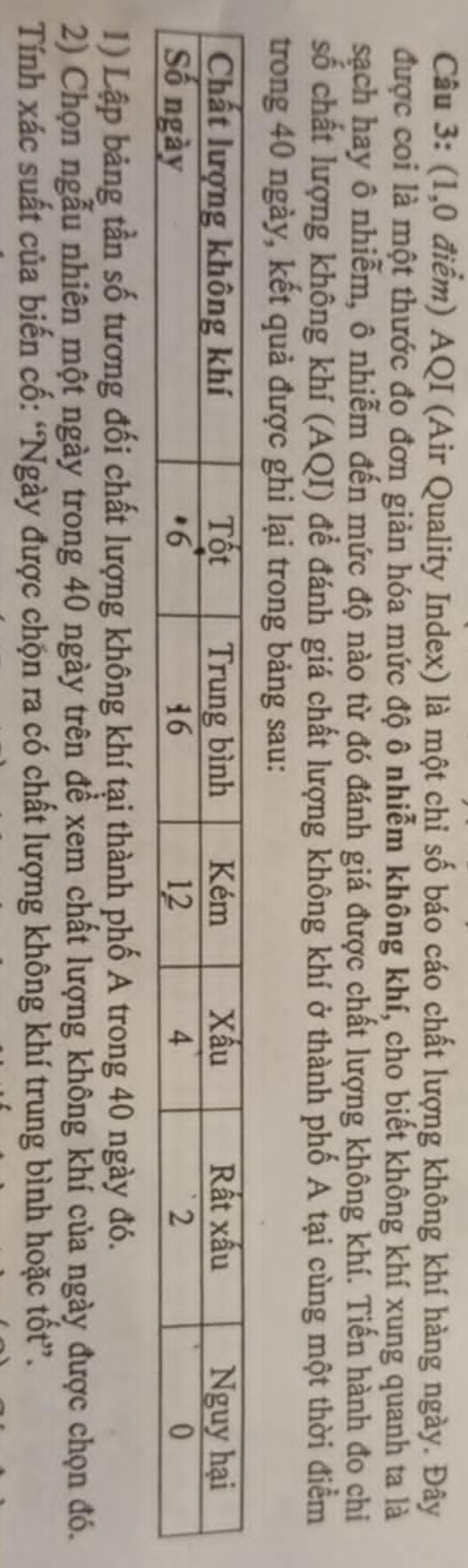 Câu 3: (1,0 điểm) AQI (Air Quality Index) là một chi số báo cáo chất lượng không khí hàng ngày. Đây