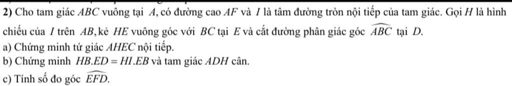 $\widehat{IBH}=\widehat{DBE}$ vì $BI$ là phân giác $\hat B$