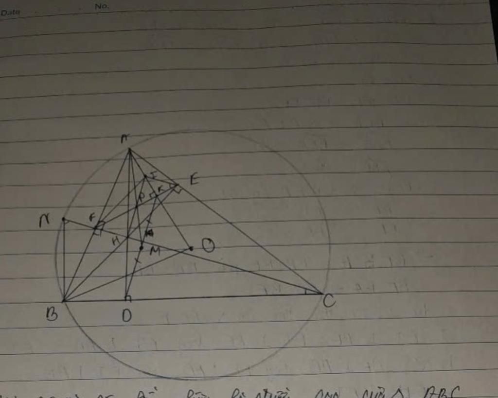Cho tam giác nhọn ABC (AB < AC) nội tiếp đường tròn (0), với các đường cao AD, BE và CF đồng quy tại H.