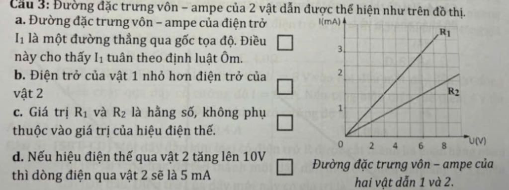 d) Sai vì từ đồ thị giá trị điện trở $R_2=4000 \Omega.$ nên khi $U=10V$ thì $I=2,5mA.$